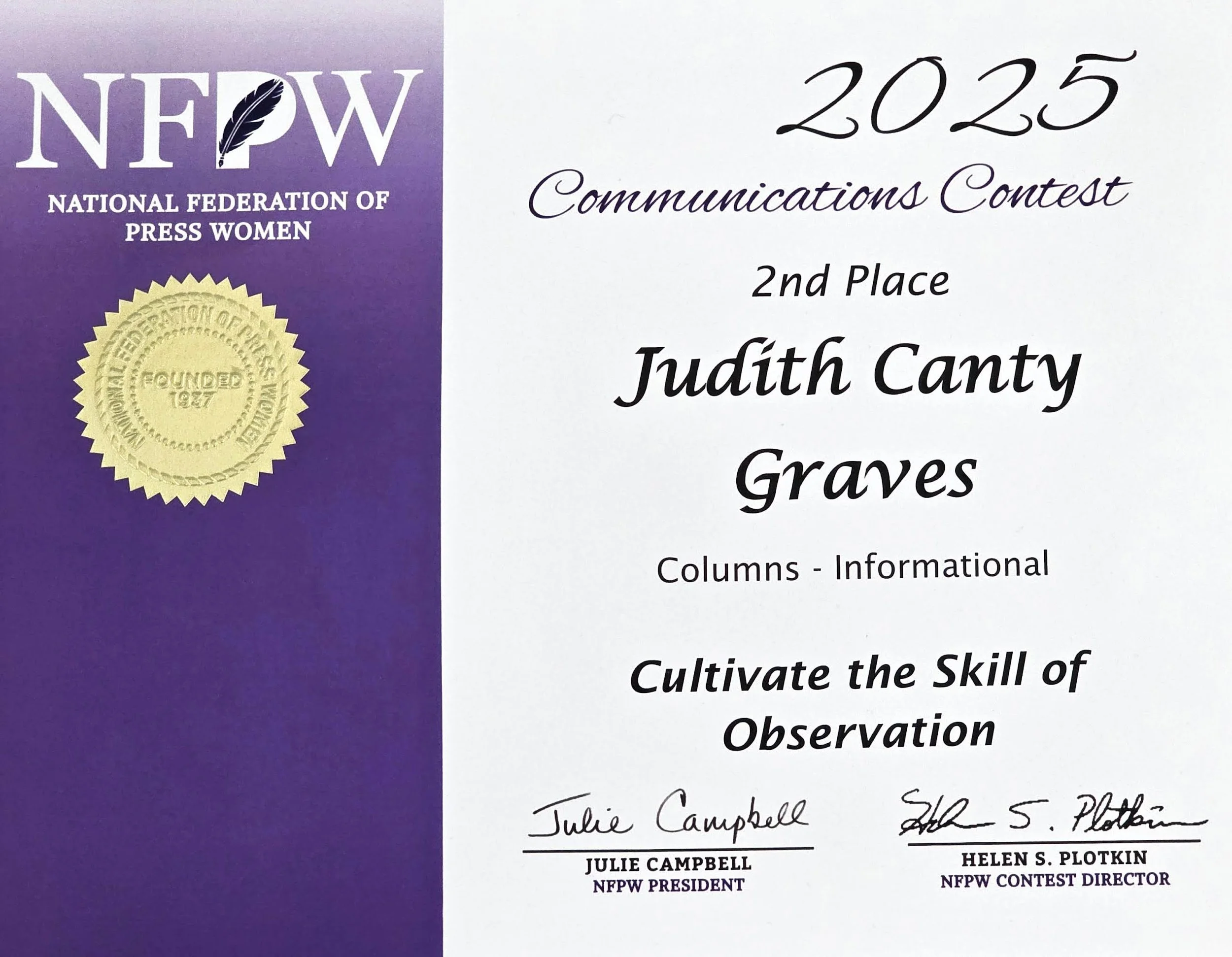 In June of 2024 the National Federation of Press Women selected Judith’s May 2023 column on peonies, “A Treasured Perennial” to receive the second place award in the Informational Columns category at their annual conference in Saint Louis, Missouri. In September of 2025 the NFPW selected Judith’s May 2024 column, “Cultivate the Skill of Observation” for a second place award for Informational Columns.